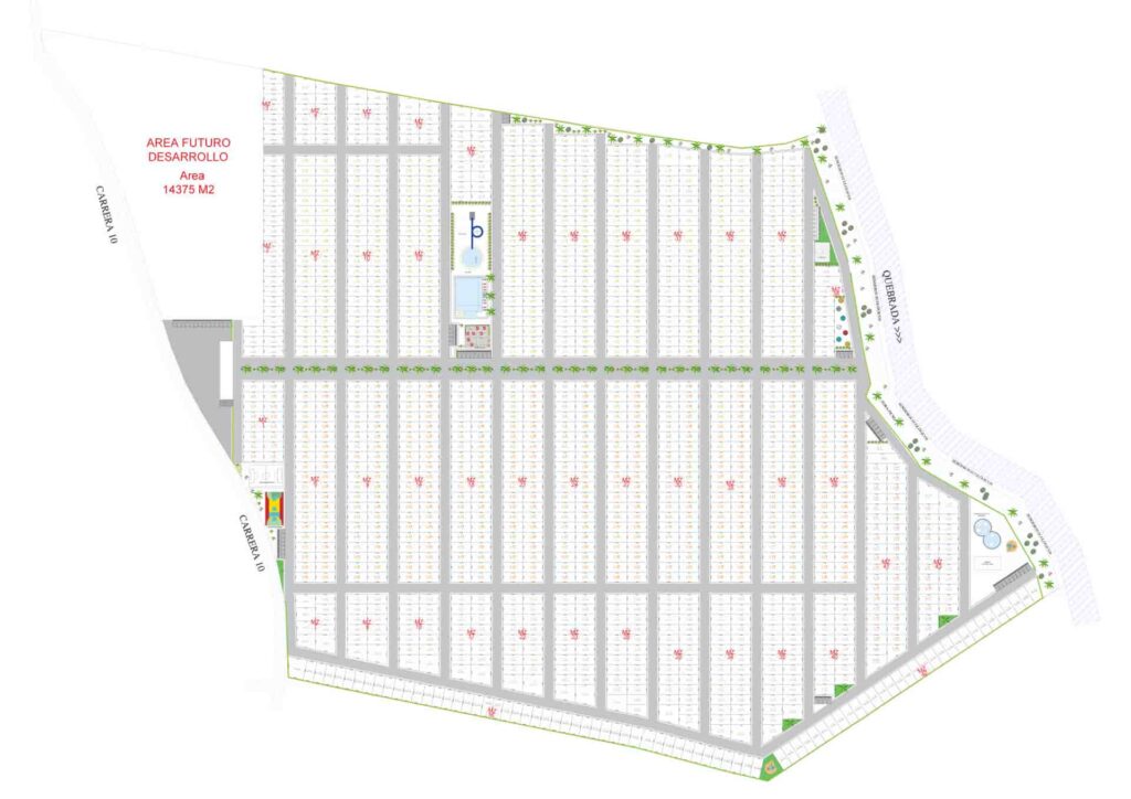 Con un total de 1.269 lotes en un terreno de aproximadas 16 hectáreas con una topografía 80% plana, se plantea un urbanismo que supla todas las necesidades para una fácil construcción de todos los propietarios.